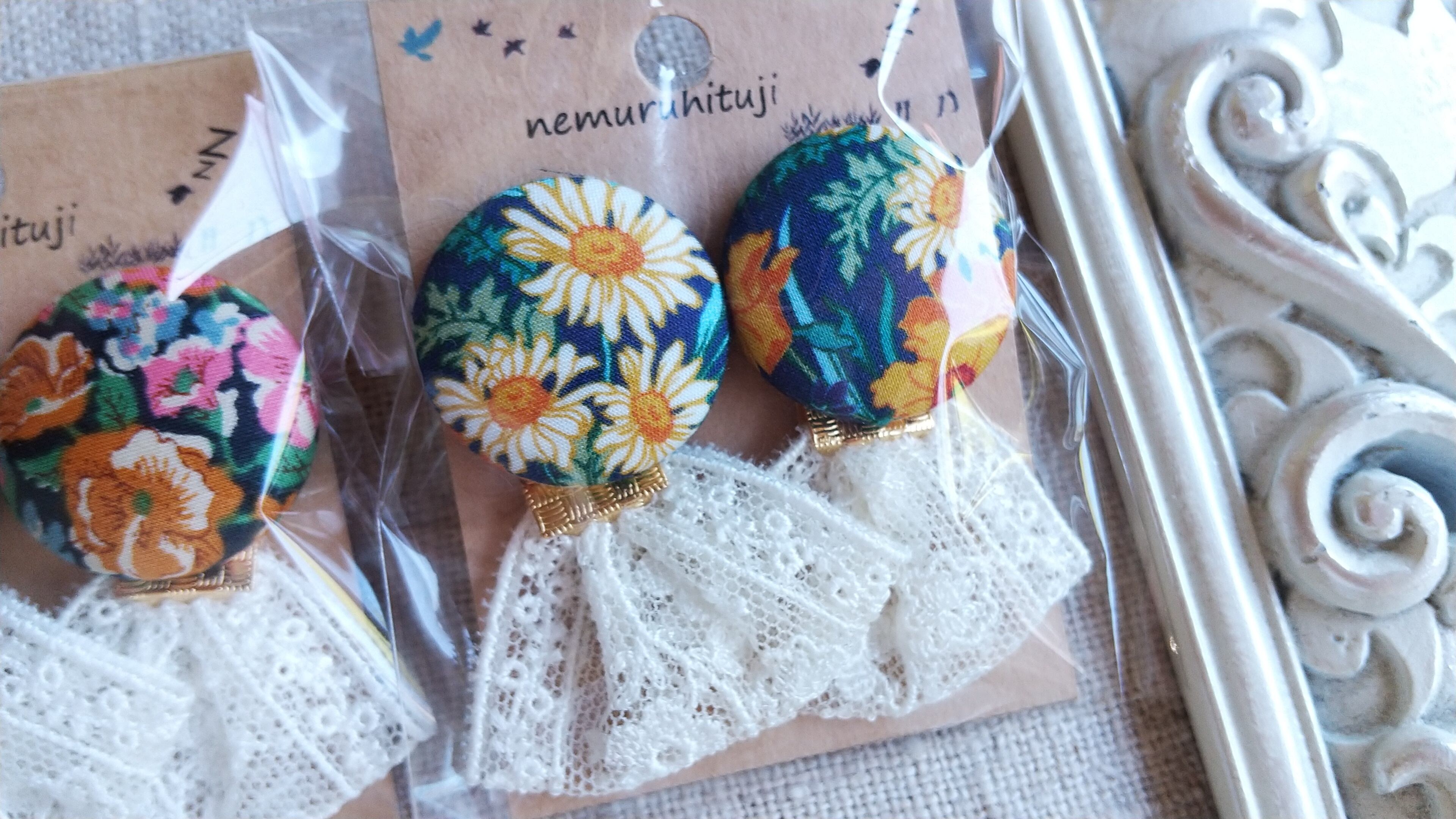 休眠堂 25(7)-1~3リバティ生地を使用したクルミボタンのイヤリング(木馬レース)
