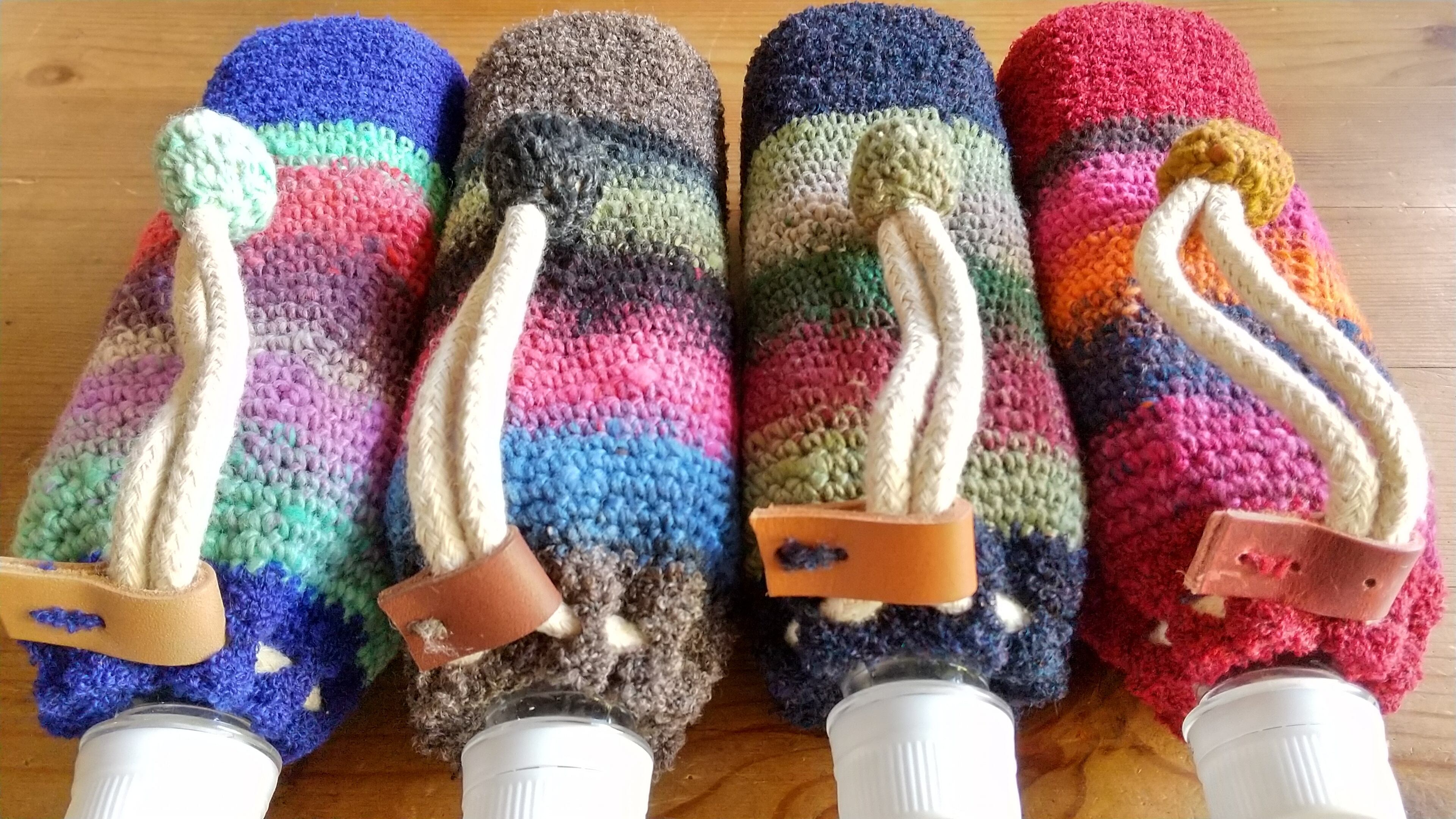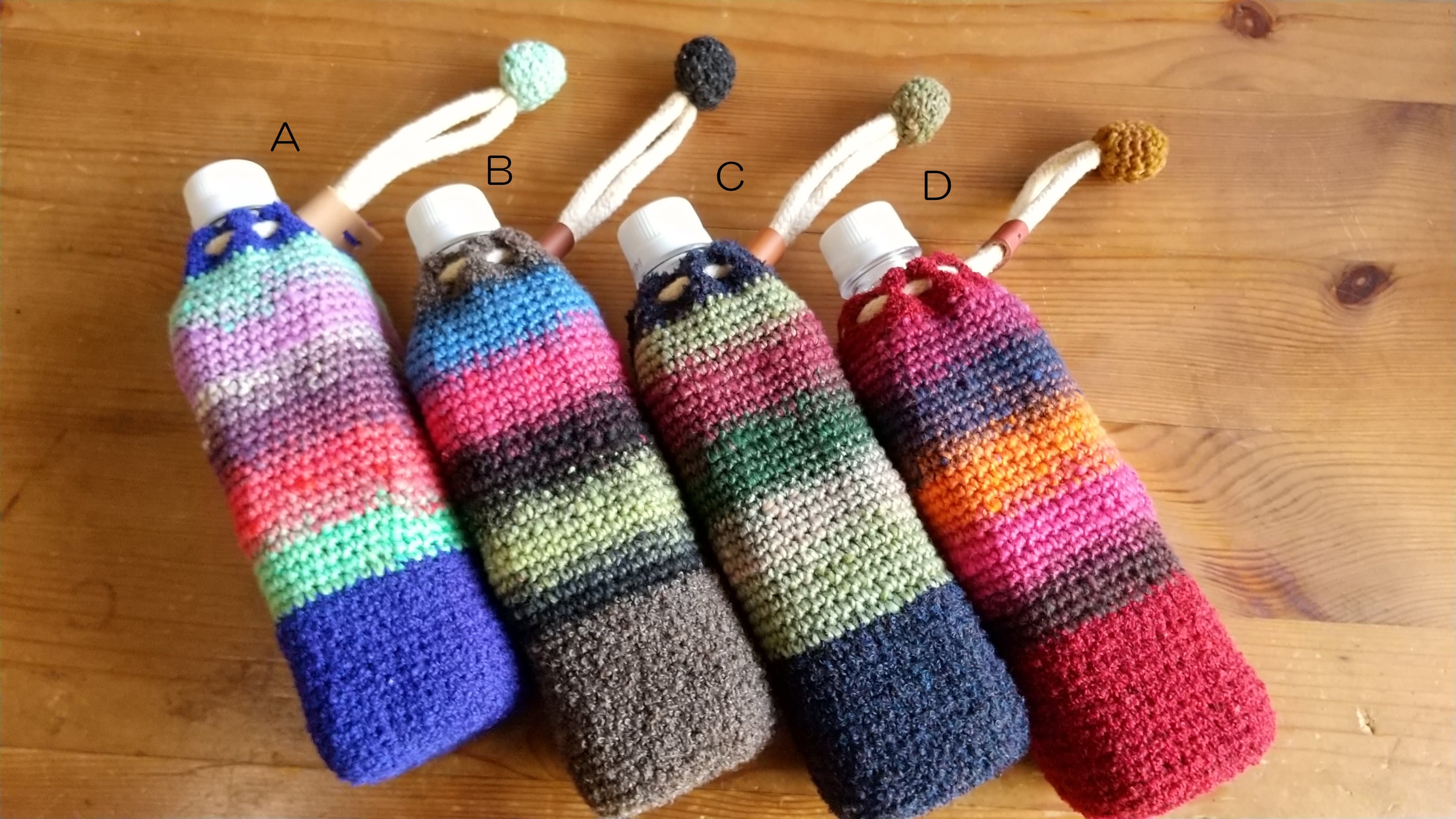 size(約):500mlペットボトルサイズ 本体底部ウール75% ナイロン25% 本体模様部分レーヨン60% ナイロン25% ウール15% コードストッパー部レザー 保冷温効果ナシ